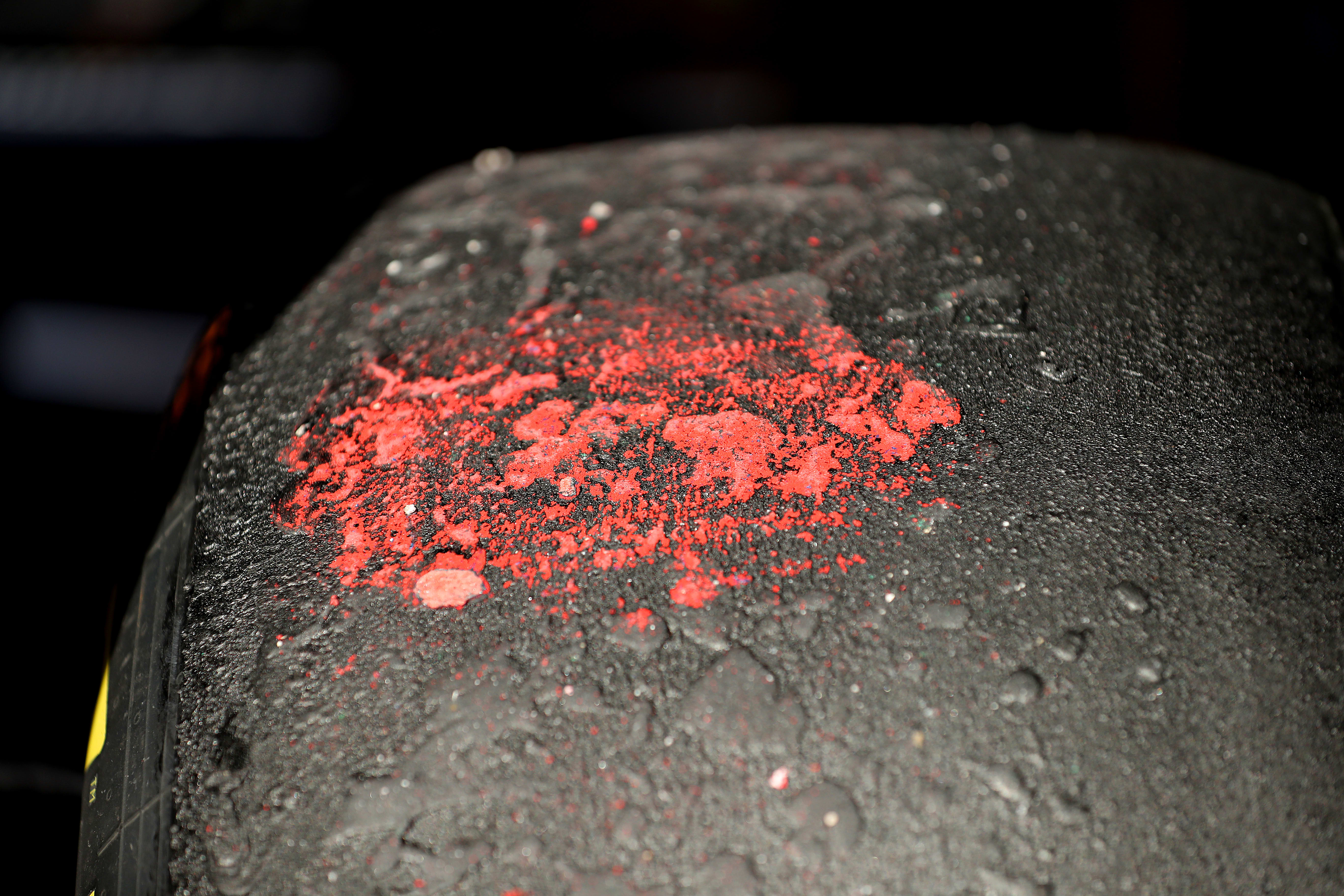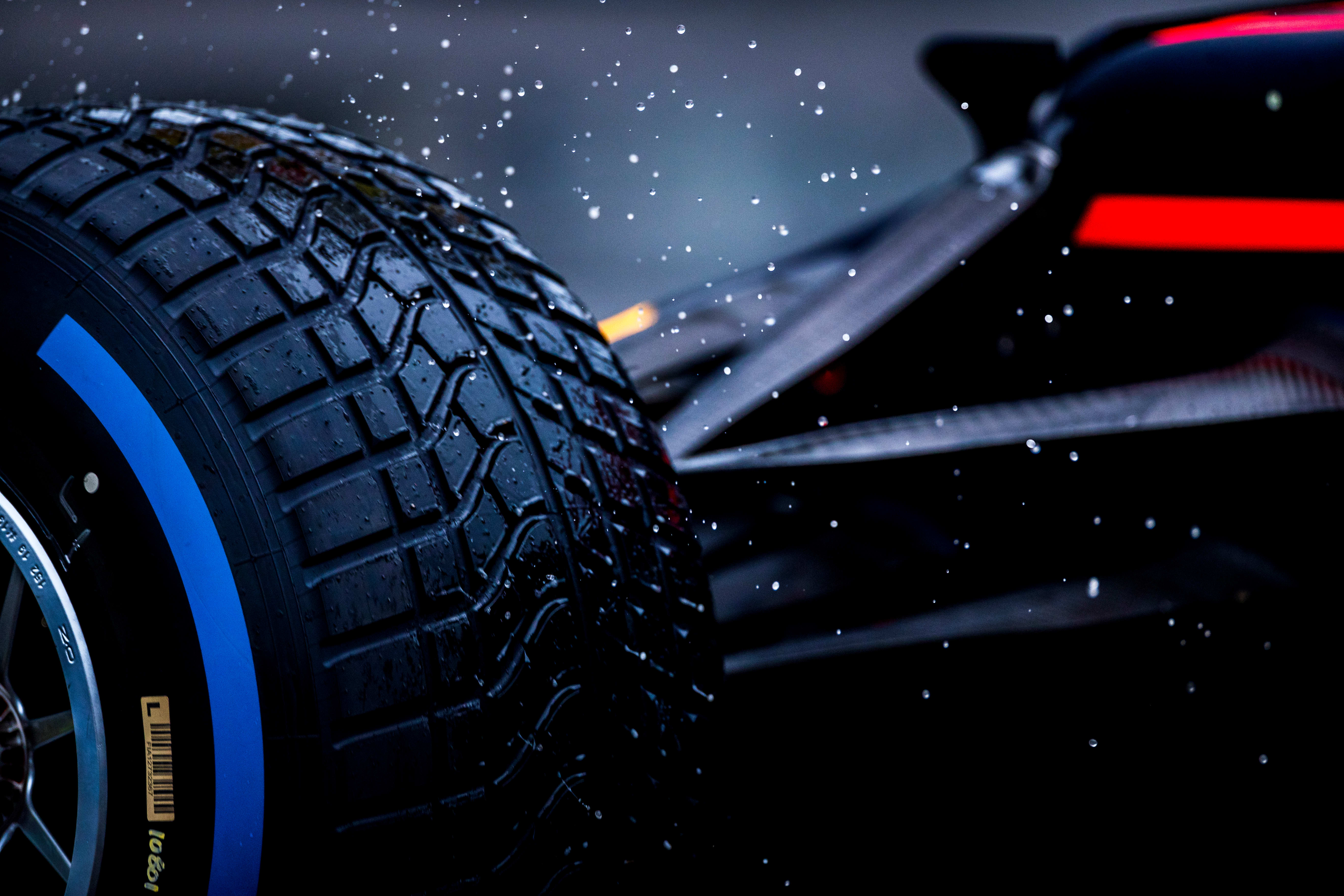 The full wet tyres are the most effective solution for heavy rain. These tyres can evacuate 85 litres of water per second per tyre at 300kph. There’s a new profile designed to increase resistance to aquaplaning, which will give the tyre more grip in heavy rain. The diameter of the full wet tyre is 10mm wider than the slick tyre.