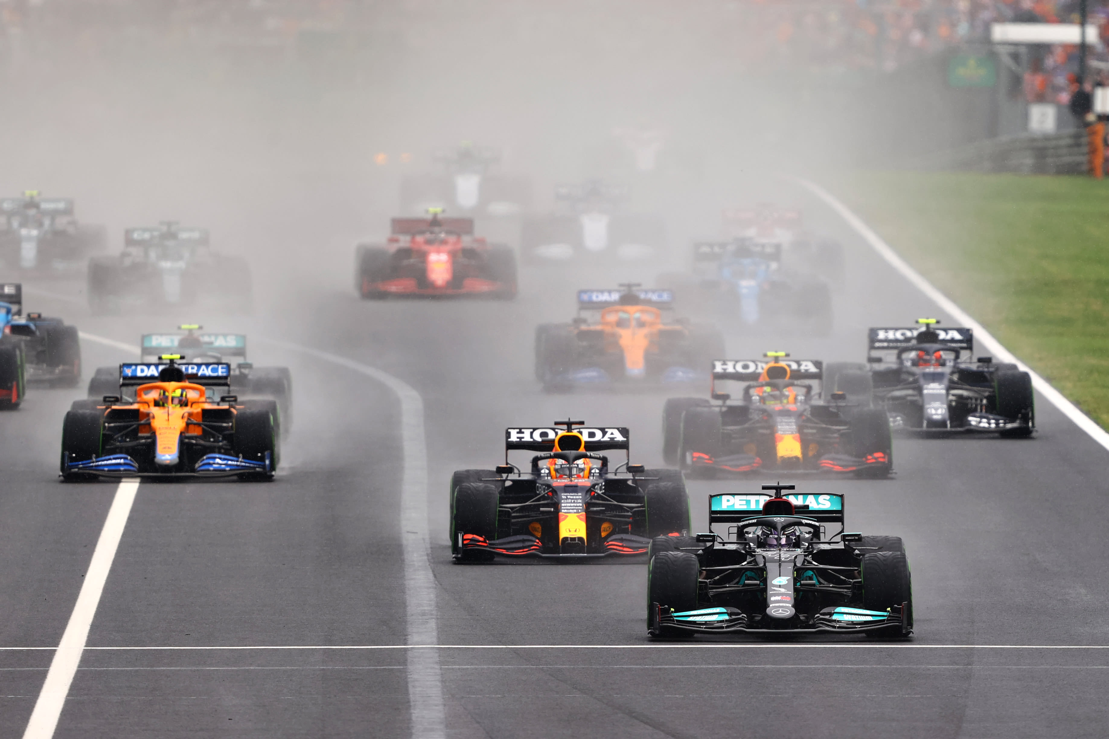 Con la pista húmeda y calzando gomas intermedias, Bottas salió mal desde la segunda plaza de la parrilla de salida y fue superado por Max, Checo y Lando Norris (McLaren). Este último se puso justo por delante del piloto de Mercedes.